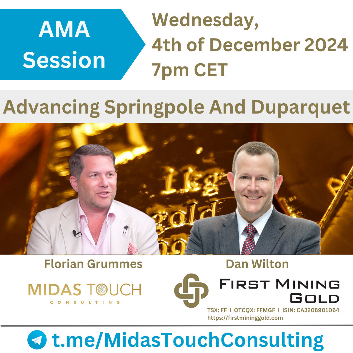 Join us for an AMA (ask me anything) Session with CEO Dan Wilton from First Mining Gold FF 0.00%β $FFMG π¨π¦. Tomorrow, Wednesday 4th of December, 2024, at 7pm CET in our telegram channel https://t.me/MidasTouchConsulting ...